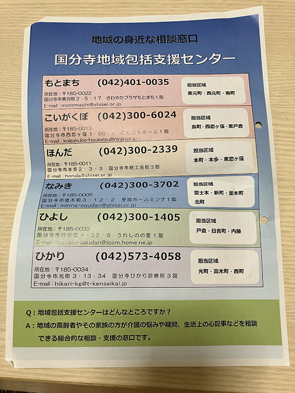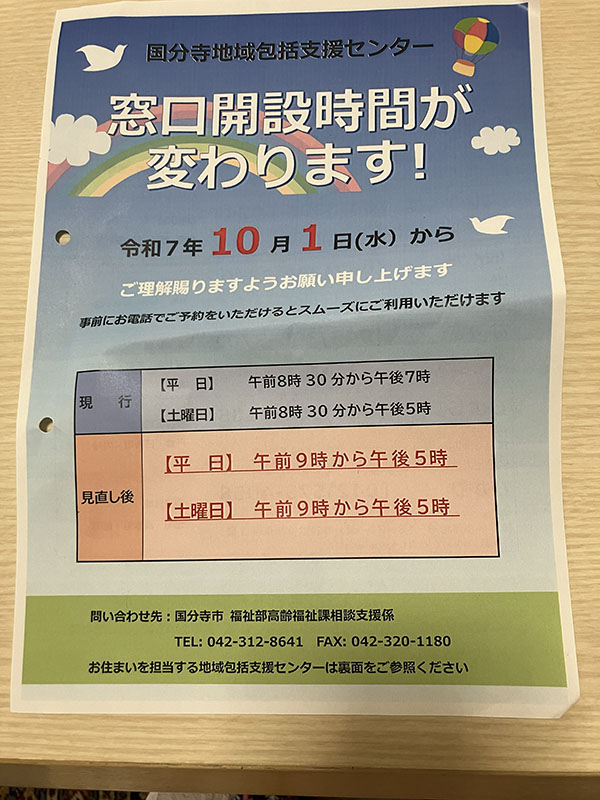 - 国分寺市の地域包括支援センターの窓口開設時間が10月1日から変更になります。